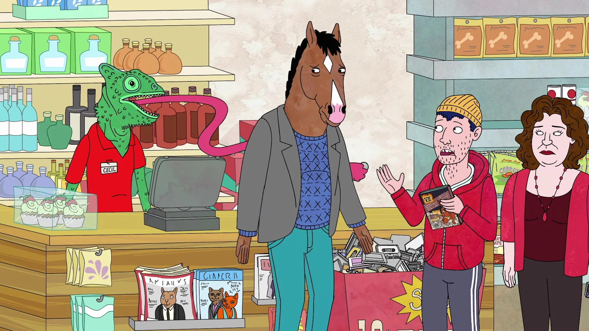 BoJack is dismayed about Todd's sudden success but still shows support. He takes Todd to get snacks at an 8-Twelve convenience store, after hearing news that potential financiers were coming to see a rehearsal tomorrow. It is at the store that Todd discovers Decapathon VII, the newest game in the video game series. It is the same series that ruined him in the past, in the ten cents bin. A woman standing behind him asks him to get a tape for her out of said bin.