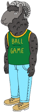 Gary is a black sheep with thick black wool, grey curved horns, and a bit of a fat stomach.