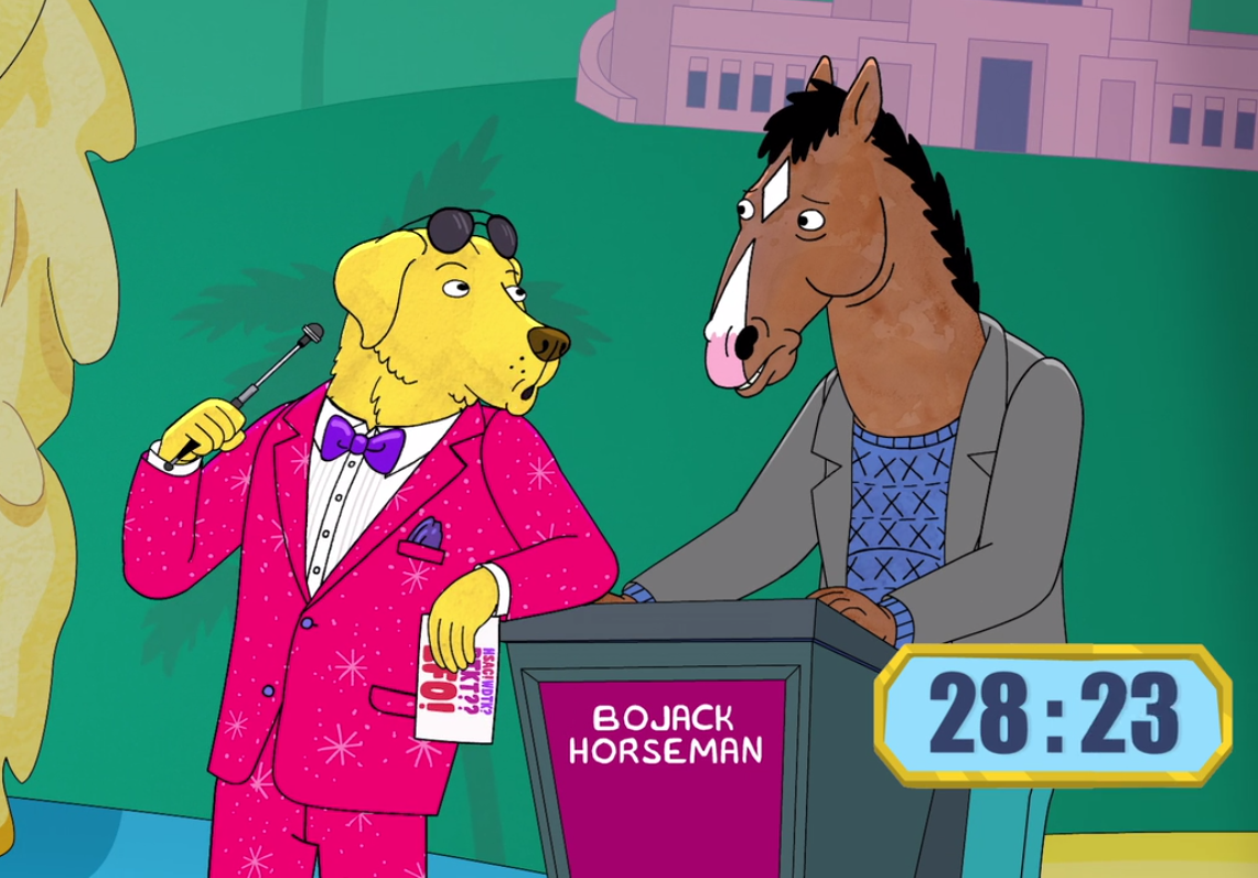 BoJack is one of the celebrity guest stars on the first episode of Mr. Peanutbutter's game show, but the game doesn't go as expected.