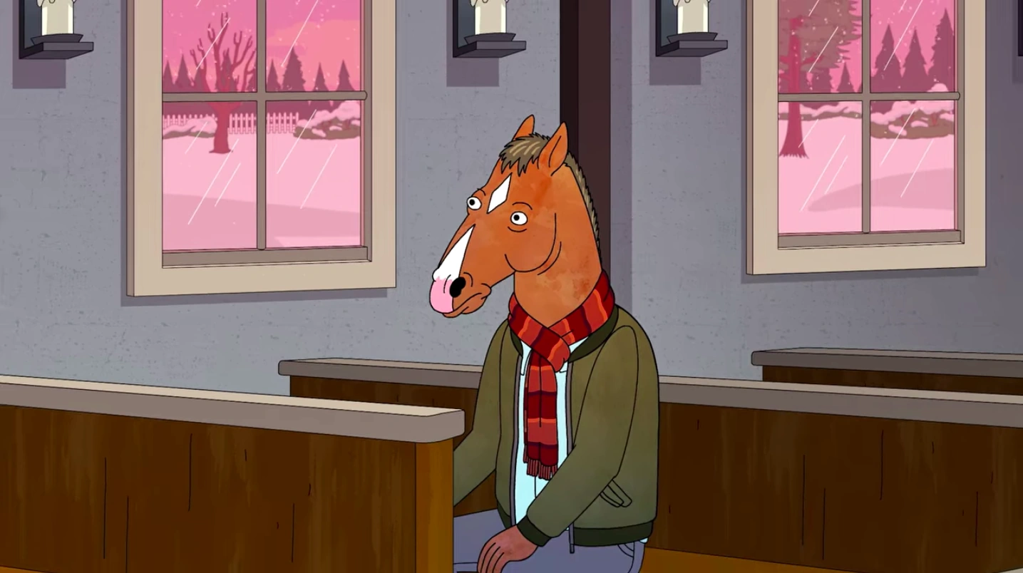 The episode ends with BoJack going to the Puritan reenactment horse town where he finds a church. He attends a reenactment of an early horse service. BoJack shakes hands and offers peace to the other horses around him. The minister observes BoJack found solace in their show. He invites BoJack to stay, as the show starts again in thirty minutes.