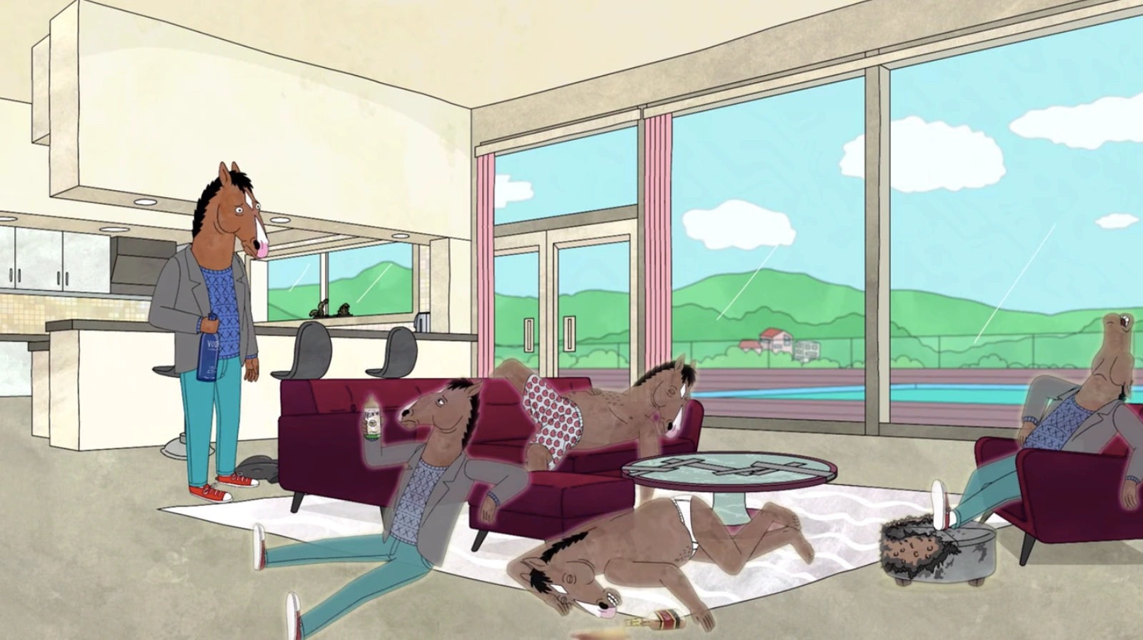 The next morning, BoJack wakes up and cleans up the living room. He then leaves the apartment and takes a scarf hanging on the coat rack as he does.
