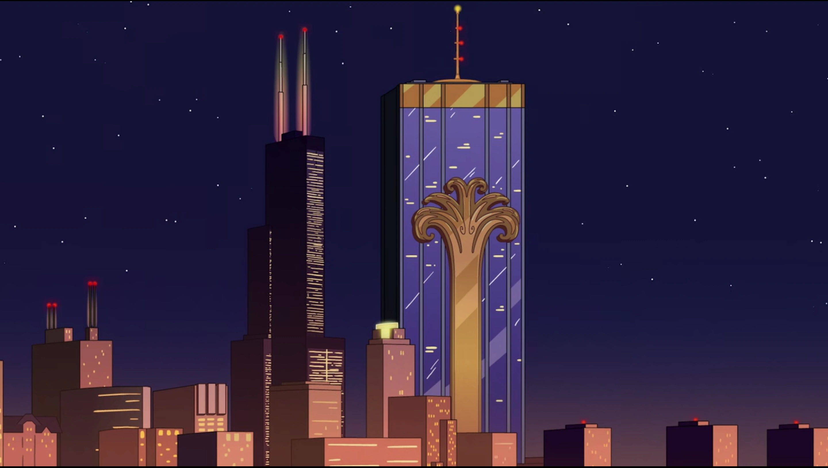 The next day, Guy says they are driving through the second big, muddy, big-shoulders city by the lake. He then points out Willis Tower and the new Whitewhale Building.